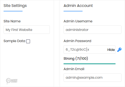 - Admin Username: Your new Concretecms username (for security reasons, do not use the administrator or the admin username).