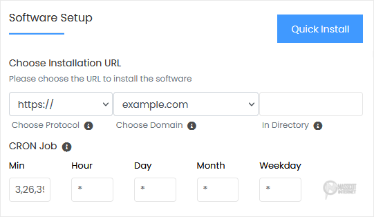 - Choose Installation URL: Choose the appropriate protocol/domain. Inside the "In Directory" field, should you want to install this in a directory, i.e., example.com/directory, enter the directory name. Otherwise, please, leave it blank to install in your main domain, i.e., example.com.